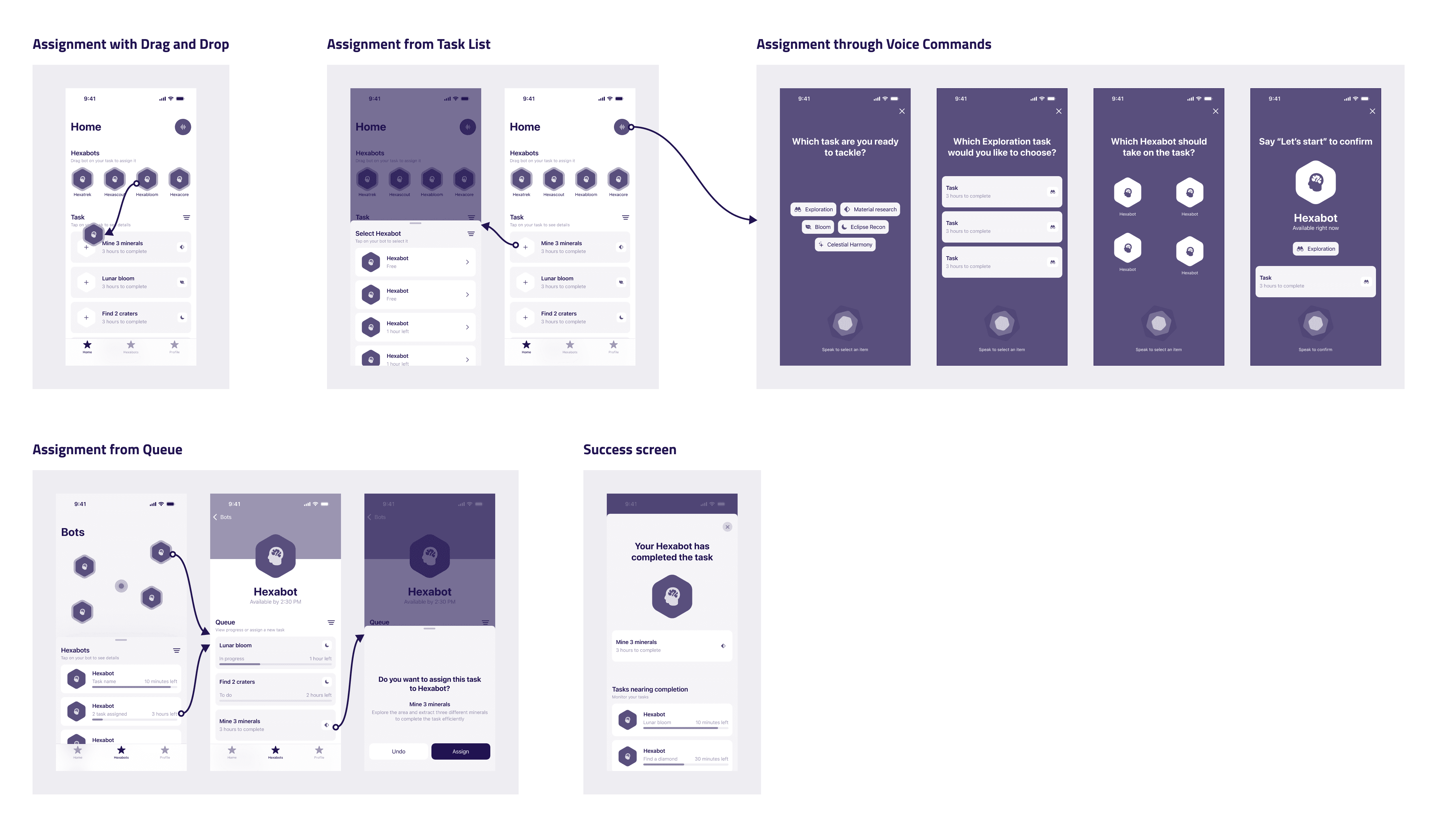 The brief asked for a task-assignment experience that feels simple, efficient and accessible. One of the main challenges was giving users a clear way to keep track of their Hexabots and assign tasks quickly without adding complexity as the number of bots and activities grows.