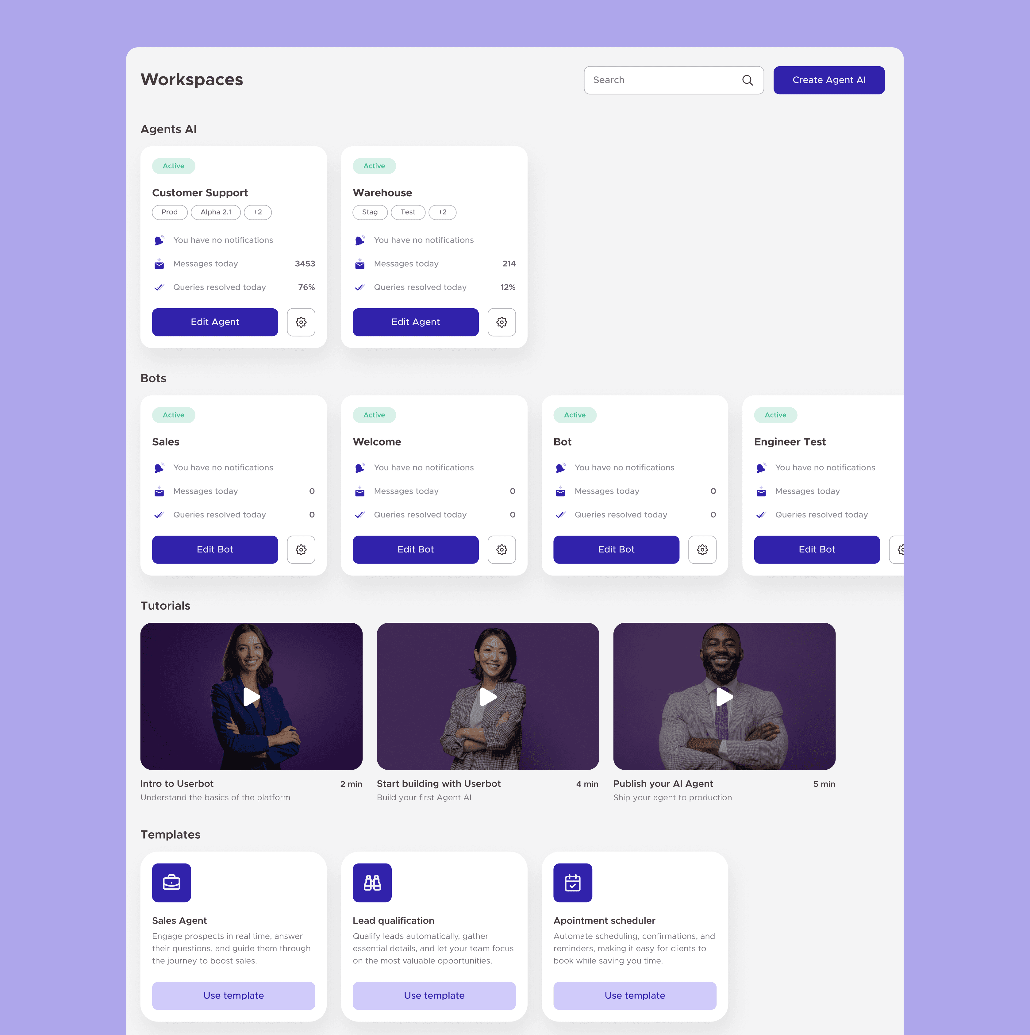 I redesigned the Workspace page, where users select and manage their AI agent projects. The challenge was presenting new AI agents clearly, making it easy to switch, access, and manage projects in a scalable and intuitive way. To support onboarding and speed up project setup, I also introduced video tutorials and ready-to-use templates, helping users get started faster and explore the platform's full potential.