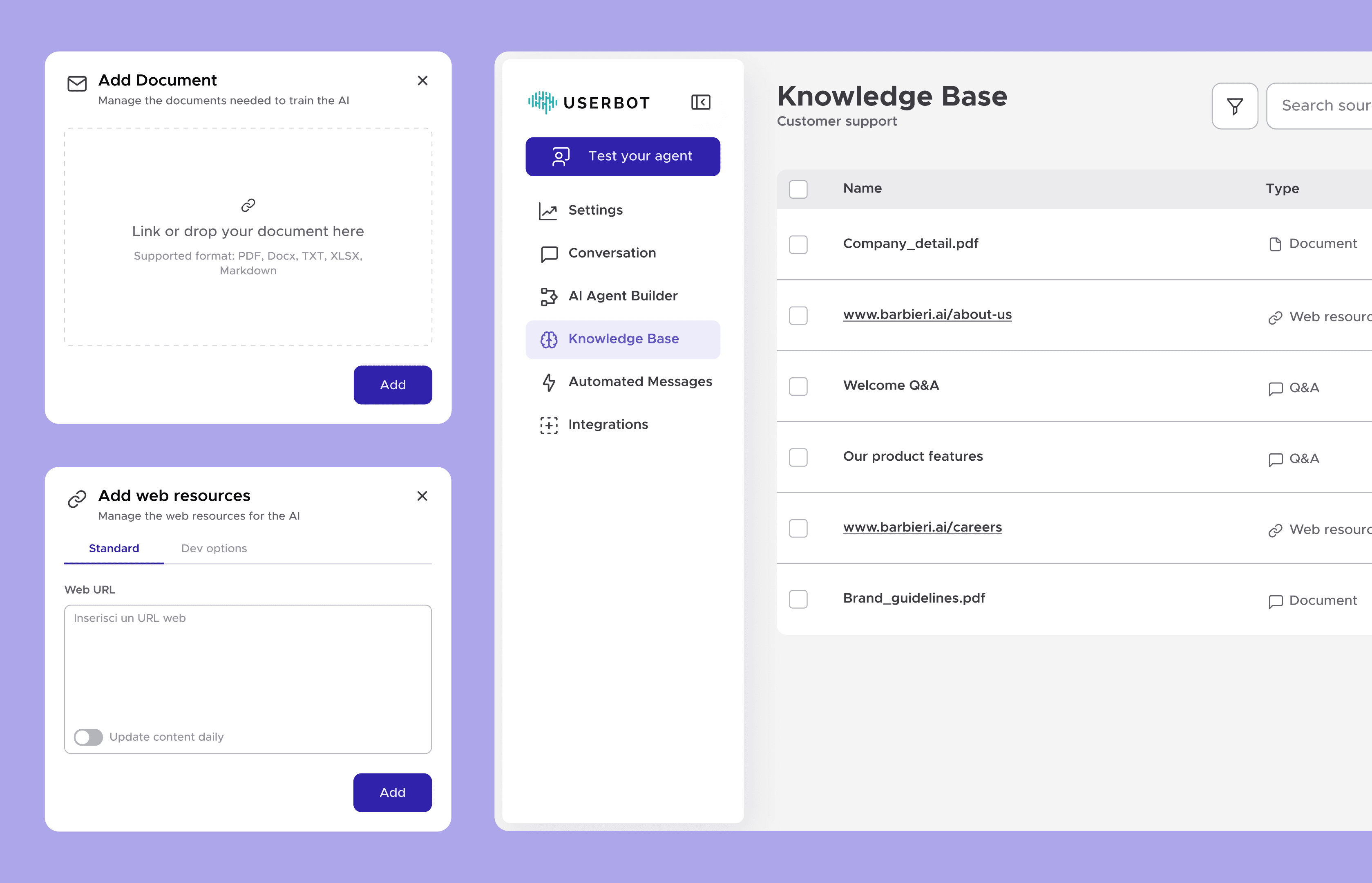 I introduced a centralized Knowledge Base where users can upload and manage documents that power agent reasoning and contextual understanding. The main challenge was designing multiple document-specific setup configurations while maintaining a consistent, scalable interface that keeps complexity under control and ensures long-term flexibility.
